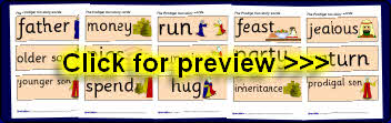 A set of printable word and picture cards linked to the parable of The Prodigal Son.