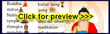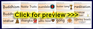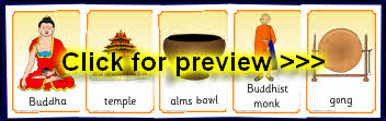 A set of printable word and picture cards featuring items and terms associated with Buddhism.