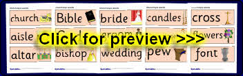 A printable set of words with accompanying pictures related to a traditional Christian church. These are great for use as aids when children are writing, or for a classroom topic display.