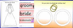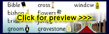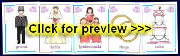 A printable set of word and picture cards featuring people and objects found at a traditional Christian church wedding.