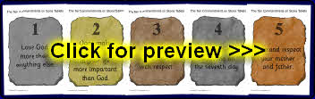The Biblical Ten Commandments presented on coloured stone tablets. Includes a simplified version for younger children.