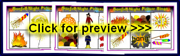 A set of bingo picture boards cards for a Bonfire Night bingo game.