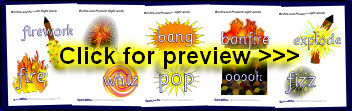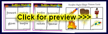 A colourful set of 16 words and accompanying pictures linked to Bonfire and Fireworks Night. Words include nouns such as ‘fire’, ‘sparkler’ and ‘bonfire’ as well as descriptive words such as ‘crackle’, ‘sparkle’, ‘bang’ and ‘whoosh’.