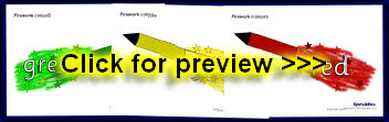 8 A4 printable sheets with different coloured firework rockets and colour-words.