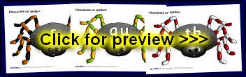 A brightly-coloured set of 50 printable spiders featuring the phonemes specified in the DfES ‘Letters and Sounds’ publication. Ideal for hanging in your classroom or for phonics displays. A colourful addition to your classroom.