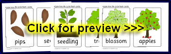 A set of printable flash cards showing the basic stages in the life cycle/growth of an apple tree.