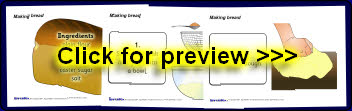 A useful set of visual aids showing how to make bread in 8 steps. It includes instructional text and a list of ingredients, together with a sheet that can be photocopied for children to sequence the pictures.