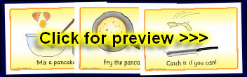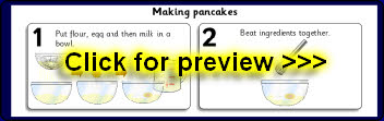 A useful set of visual aids showing how to make a pancake in 6 steps. It includes instructional text and a list of ingredients, together with a sheet that can be photocopied for children to sequence the pictures.