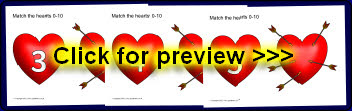 A printable activity where children match the numbered hearts to the hearts pierced by Cupid’s arrows.