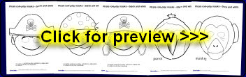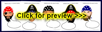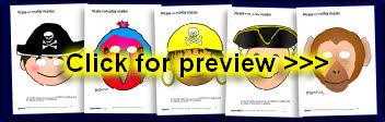 A useful group of pirate-themed printable masks for role-play. Includes different pirates (for boys and girls) together with a parrot, monkey and colonial officer masks. Simply print out, laminate, cut out and attach to lollipop sticks!