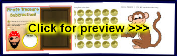 Printable desktop activity mats where children roll a dice and place coins in the pirate chest. They roll again for the monkey to sneak some away, then write the total or number sentence.