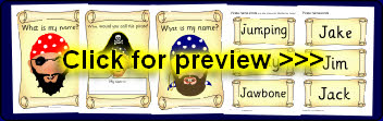 Posters for discussion where children can make up alliterative names for the pirates. Also includes word cards to help construct alliterative pirate names.