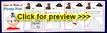 A set of instruction visual aids showing how to make a simple paper pirate hat. Ideal for teaching about writing instructions.