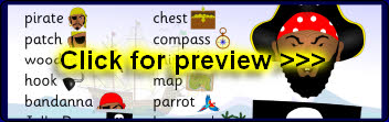 A printable word mat featuring words and pictures linked to pirates. Ideal for children to use as prompts when writing.