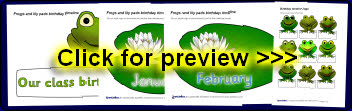 A set of printable lily pads and frogs for a birthday timeline display. 12 lily pads for each month of the year, together with pupil frogs to place on the relevant lilies.