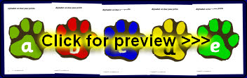 The lowercase alphabet letters presented on coloured bear paw prints.