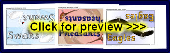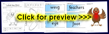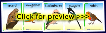 Cut-and-stick worksheets where pupils label the birds, as well as word cards and bird pictures for whole-class discussion.