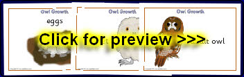 A set of printable flash cards showing the basic stages in the life cycle of an owl.