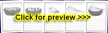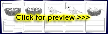 A set of simple printable sheets featuring images of robin growth for children to colour along with writing lines for topic-related writing.