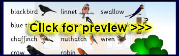 A printable word mat featuring names and pictures of UK garden birds. Great for children to use as prompts when writing or as a ‘bird spotter’ sheet.