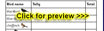 A simple printable worksheet for pupils to conduct a garden birds survey. They record the birds they see using tally marks and then add the totals.