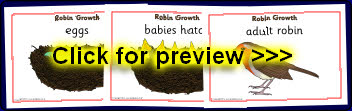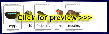 A set of printable flash cards showing the basic stages in the life cycle of a robin.