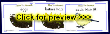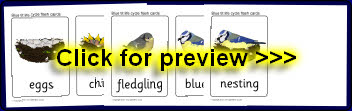 A set of printable flash cards showing the basic stages in the life cycle of a blue tit.