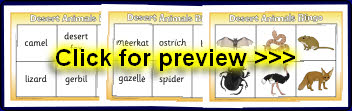 A set of printable picture cards featuring various desert animals. Also includes a set of smaller word cards for matching activities.
