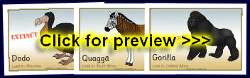 A set of posters showing various extinct and endangered animals and where they live/lived.