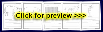 A set of simple printable sheets featuring images of farmyard items and animals for children to colour along with writing lines for topic-related writing.