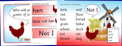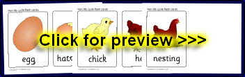 A set of printable flash cards showing the basic stages in the life cycle of a hen.