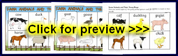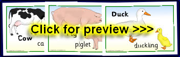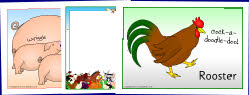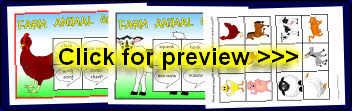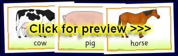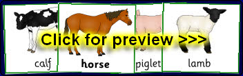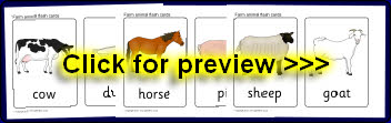 A set of printable picture cards featuring various farm animals. Also includes a set of smaller word cards for matching activities.