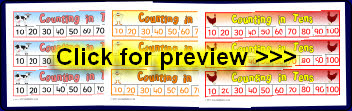 Printable counting in tens number tracks themed with cartoon farm animals.