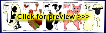 A group of body part sets which can be assembled into split-pin characters with moving parts. Children cut out the body parts and use split-pins to join together at the appropriate places.