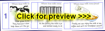 A set of posters showing the stages to bring milk from the farm to your breakfast table.