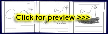 A set of simple printable sheets featuring images of hen growth for children to colour along with writing lines for topic-related writing.