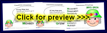 A set of 8 simple posters showing the ‘MRS GREN’ acronym of the 7 life processes with a ‘Mrs Gren’ character.