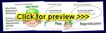 A set of 8 simple posters showing the ‘MRS NERG’ acronym of the 7 life processes with a ‘Mrs Nerg’ character.