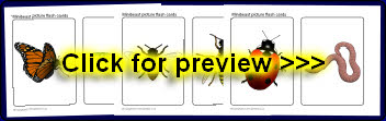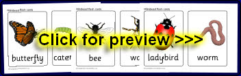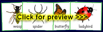 A set of printable picture cards featuring various minibeasts. Also includes a set of smaller word cards for matching activities.