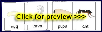 A set of printable flash cards showing the basic stages in the life cycle of an ant.