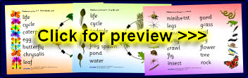 A set of 3 printable A4-size word mats which include words and images linked to minibeasts. If laminated these can be used time-and-time again to aid children with their writing and promote topic-related discussion. Download includes a general minibeast word mat, and two mats related to butterfly and frog life cycles.