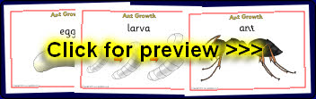 Simple A4-sized printable posters showing different stages in the growth of an ant.