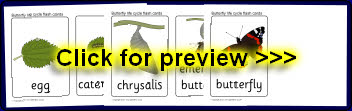 A set of printable flash cards showing the basic stages in the life cycle of a butterfly.