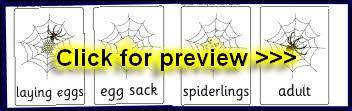 A set of printable flash cards showing the basic stages in the life cycle of a spider.
