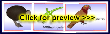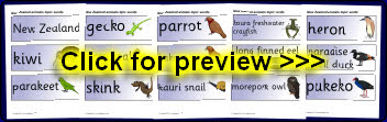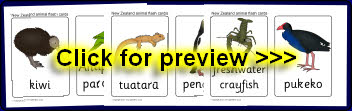 A set of printable picture cards featuring various New Zealand animals. Also includes a set of smaller word cards for matching activities.