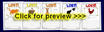 Printable writing frames for lost pet posters. With space to write the pet’s name, type of animal, description and phone number, together with a drawing of the pet.