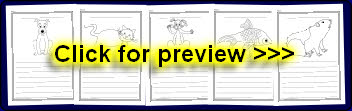 A set of simple printable sheets featuring cartoon pet illustrations for children to colour along with writing lines for topic-related writing.