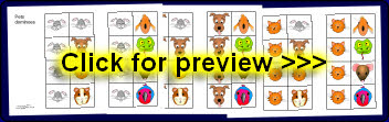 Printable squares featuring different pets. Ideal for use when creating a pictogram to showing the results of a class pets survey.
