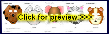 A fun set of printable pet animal masks for role-play. Simply print out, laminate, cut out and attach to lollipop sticks.