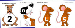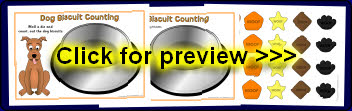 Printable desktop activity mats where children roll a dice/pick a card and place that number of dog biscuits in the bowl.